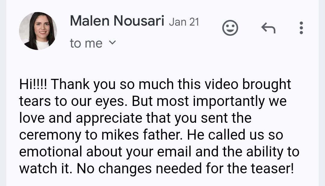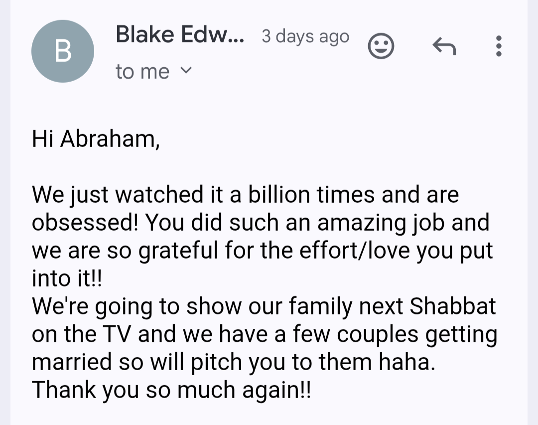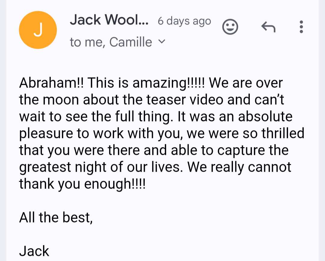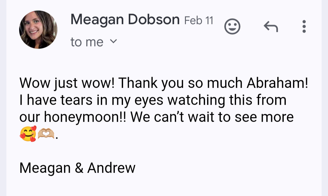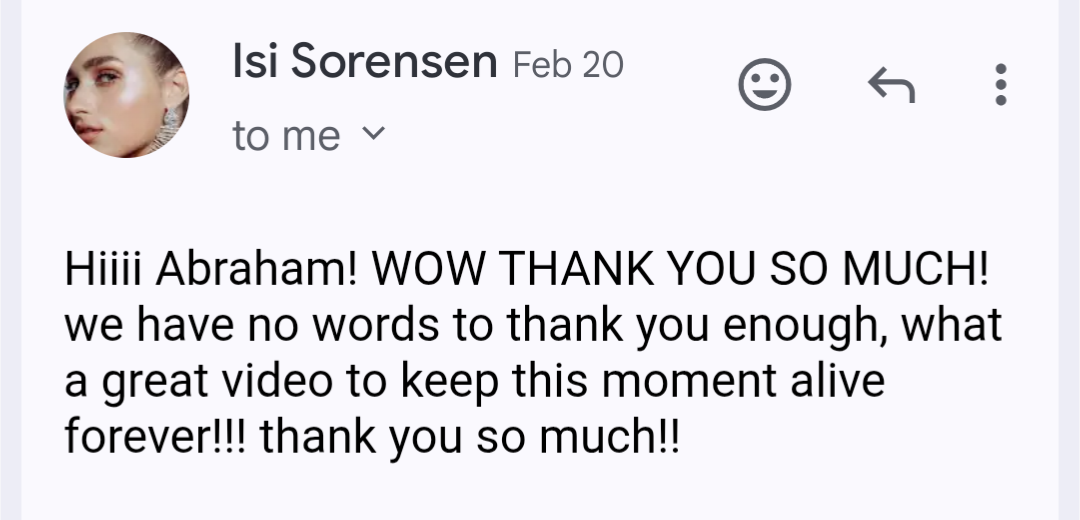 “Oh my gosh Abraham I am in tears!!!!! What a perfect video reliving the entire day, wow. Thank you so so much for capturing this.”