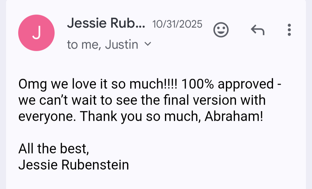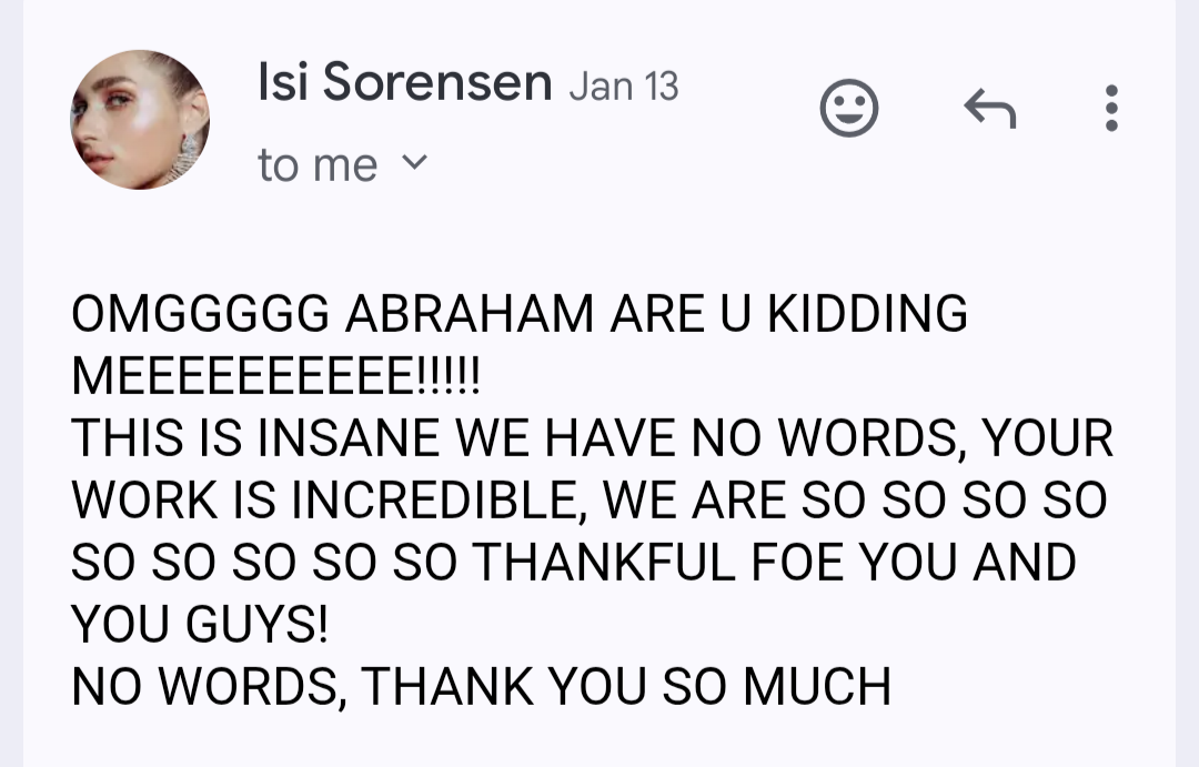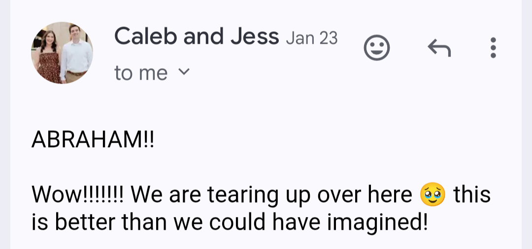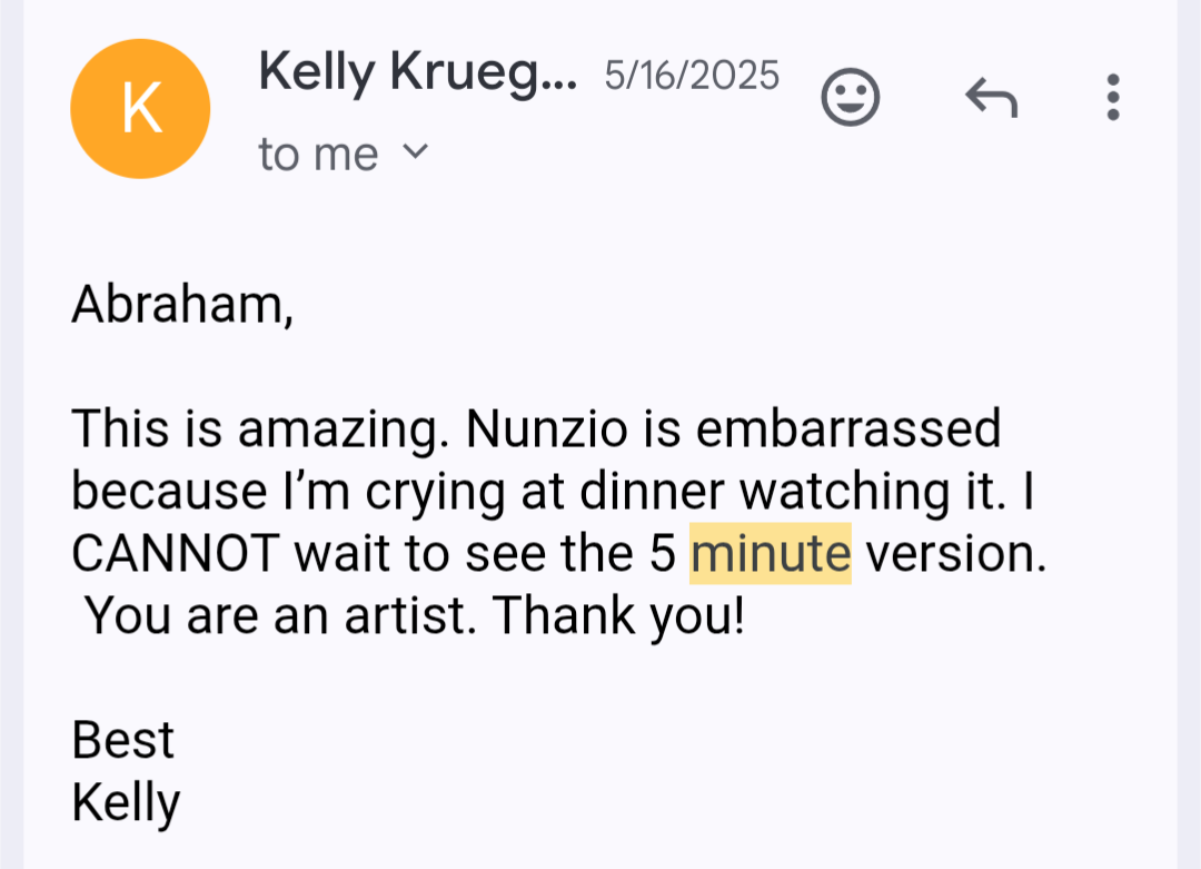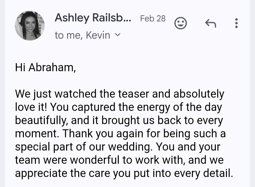 “Oh my gosh Abraham I am in tears!!!!! What a perfect video reliving the entire day, wow. Thank you so so much for capturing this.”